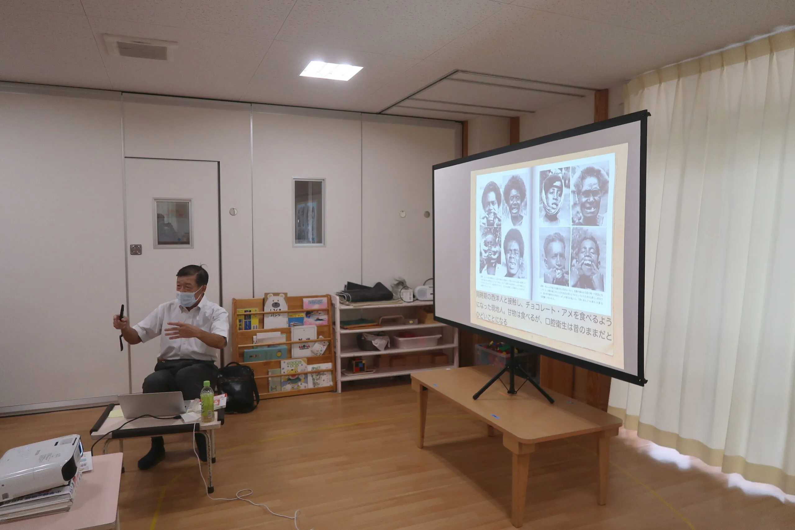 園歯科医として開設当初から携わっている保育園に昨日はその保護者向けに歯科のお話をしてきました。コロナ下のためと会場の大きさもあり参加者10名というこじんまりした会でしたが、みなさん熱心に聞いてくださり質問も多くいただけました。「甘い物をどのように子供に与えたら良いですか?」という質問には、「子供さんとおやつの時間を決めて置いたら良いと思います」と答えました。そうすることにより子供も我慢することを覚えるし、保護者も与えるべきかどうか悩むこともなくなると思います。歯磨きをされるのを嫌がる子供さんに対する質問には、しっかり磨こうと羽交い締めにするのでなく、多少磨き方は雑になっても楽しい雰囲気で歯磨きされるのを嬉しがるようにした方が良いと話しました。甘いものを食べたらすぐ虫歯になるわけではないので、長い目で口腔の衛生状態無理なく保つようにしていただきたいものです。