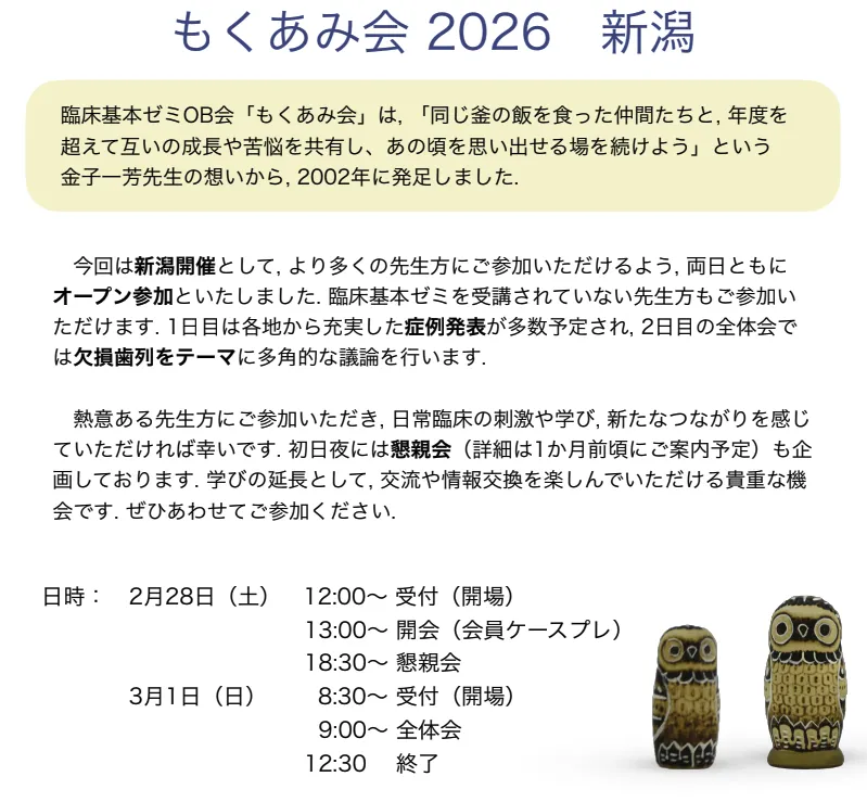 2月28日と3月1日は新潟で行われた『もくあみ会』という若手歯科医の勉強会に出席してきました。『もくあみ会』は私が所属する司会のスタディグループが主催する研修会の卒業生が、素卒後も勉強を続けようということで形成され毎年一回症例検討会のような形で開催されています。私は研修会の講師の一人として招待される立場として参加してきました。みなさん研究熱心で、真面目に患者さんに寄り添った治療の経過を発表されていました。私にとっても良い勉強になり、良い刺激をいただいて帰ってきました。